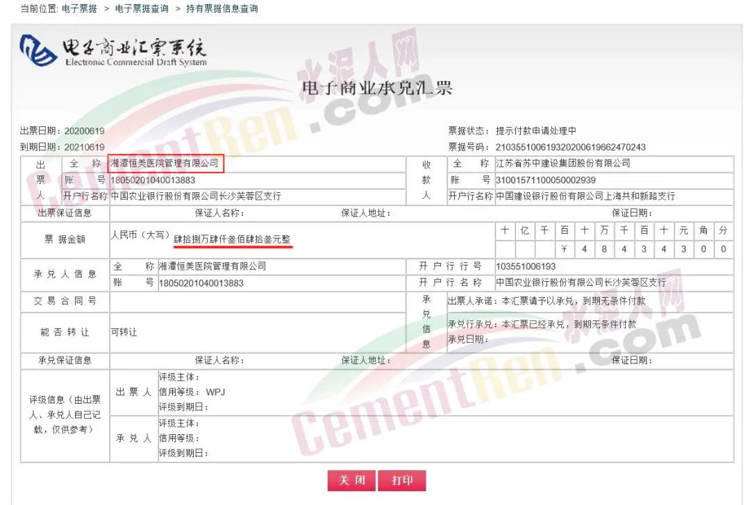 2021年6月19日,湘潭恒美醫(yī)院管理有限公司向江蘇省蘇中建設(shè)集團(tuán)股份有限公司開出的一張一年期48.4萬元商業(yè)承兌匯票到期,債務(wù)人仍未付款,票據(jù)被申請(qǐng)付款處理中。