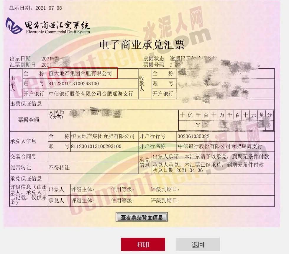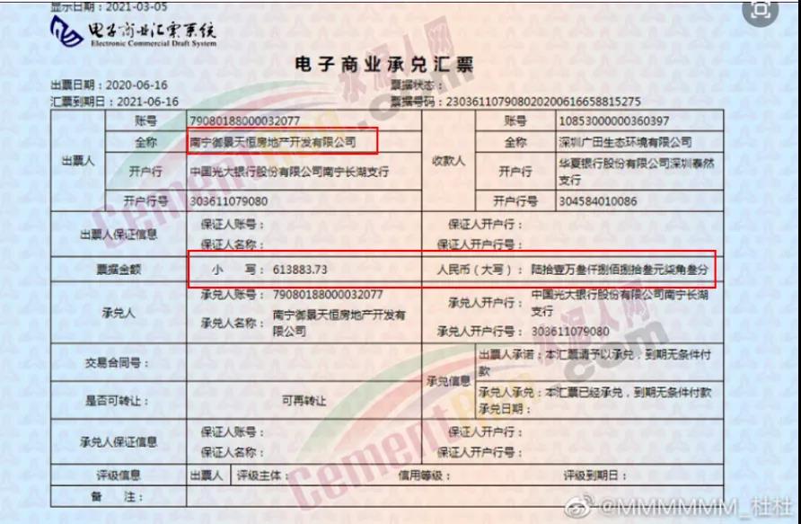 內(nèi)部員工:“本公司持有多張恒大商業(yè)承兌匯票,已經(jīng)嚴(yán)重逾期了,我司與恒大負(fù)責(zé)兌付的人員多次協(xié)商,前面承諾2021年6月10日前將5月份到期的票據(jù)兌付完畢,現(xiàn)到期后,還以各種理由推脫,回款遙遙無期。6月16日到期的也同樣未得到回復(fù)。”
