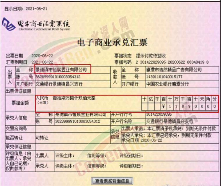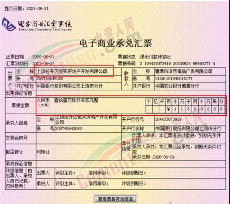 2021年6月22日,由江西恒大地產(chǎn)簽發(fā)的商業(yè)承兌匯票多張到期不兌付,景德鎮(zhèn)市恒宸置業(yè)、景德鎮(zhèn)德泰房地產(chǎn)、上海經(jīng)開區(qū)恒實(shí)房地產(chǎn)均存在未兌付票據(jù)共計(jì)46.3萬元,商戶愿意接受恒大的票據(jù)是對(duì)恒大的信任,然而事實(shí)卻是這份難得的信任也遭到了踐踏。