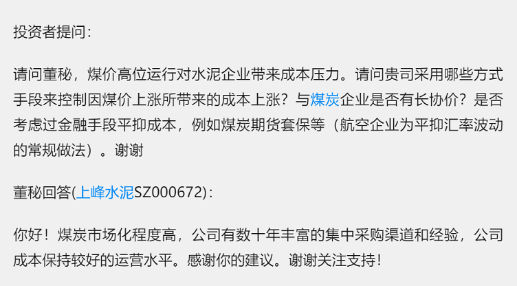 請(qǐng)問董秘,煤價(jià)高位運(yùn)行對(duì)水泥企業(yè)帶來成本壓力。請(qǐng)問貴司采用哪些方式手段來控制因煤價(jià)上漲所帶來的成本上漲?與企業(yè)是否有長協(xié)價(jià)?是否考慮過金融手段平抑成本,例如煤炭期貨套保等(航空企業(yè)為平抑匯率波動(dòng)的常規(guī)做法)。謝謝