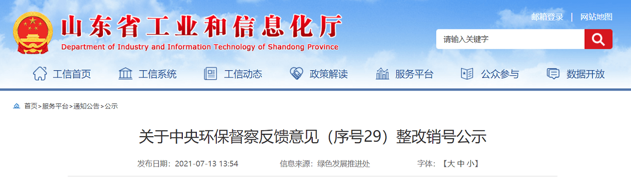 根據(jù)中央環(huán)保督察要求,中央環(huán)保督察反饋意見中第29項由山東省工業(yè)和信息化廳負(fù)責(zé)的整改內(nèi)容已完成整改,現(xiàn)進(jìn)行銷號公示,公示時間2021年7月13日至19日(共5個工作日)。