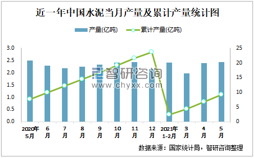 根據(jù)國(guó)家統(tǒng)計(jì)局?jǐn)?shù)據(jù)顯示:2021年5月中國(guó)水泥產(chǎn)量為2.4億噸,同比下降3.2%;2021年1-5月中國(guó)水泥累計(jì)產(chǎn)量為9.2億噸,累計(jì)增長(zhǎng)19.2%;2015-2020年中國(guó)水泥產(chǎn)量2018年跌至最低,此后呈現(xiàn)上升趨勢(shì)。
