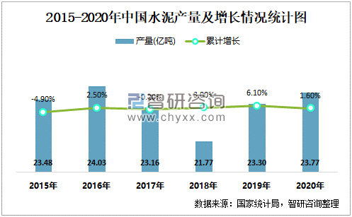 2015-2020年中國(guó)水泥產(chǎn)量及增長(zhǎng)情況統(tǒng)計(jì)圖