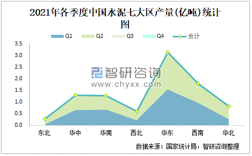 2021年各季度中國(guó)水泥七大區(qū)產(chǎn)量統(tǒng)計(jì)圖