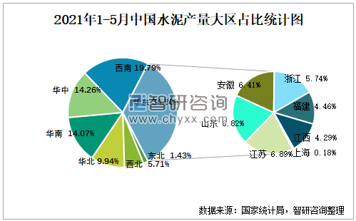 2021年1-5月中國(guó)水泥產(chǎn)量大區(qū)占比統(tǒng)計(jì)圖