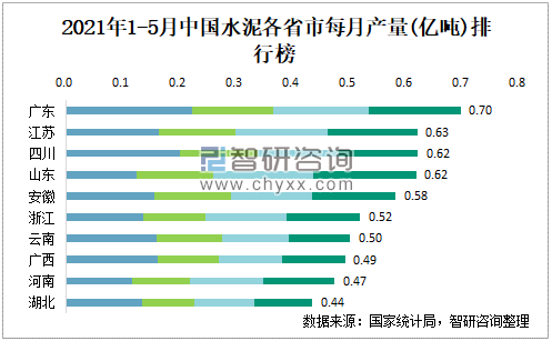 2021年1-5月中國(guó)水泥各省市每月產(chǎn)量排行榜