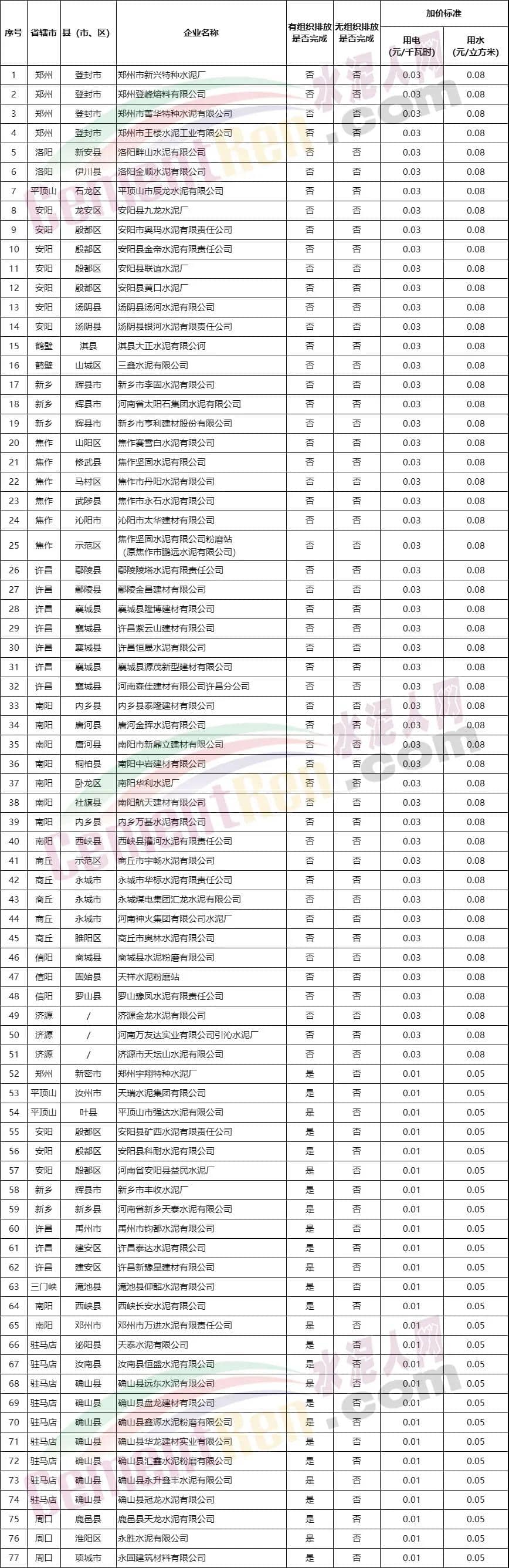 7月1日,河南省發(fā)改委發(fā)布《關(guān)于對(duì)未完成超低排放改造鋼鐵水泥企業(yè)實(shí)施差別化電價(jià)水價(jià)的通知》。根據(jù)通知,河南省發(fā)改委決定自2021年7月1日起,對(duì)河南昌泰不銹鋼板有限公司等83家有組織排放、無(wú)組織排放均不達(dá)標(biāo)的企業(yè),用電加價(jià)0.03元/千瓦時(shí)、用水加價(jià)0.08元/立方米;對(duì)鄭州宇翔特種水泥廠等27家有組織排放、無(wú)組織排放僅一項(xiàng)達(dá)標(biāo)的企業(yè),用電加價(jià)0.01元/千瓦時(shí)、用水加價(jià)0.05元/立方米。