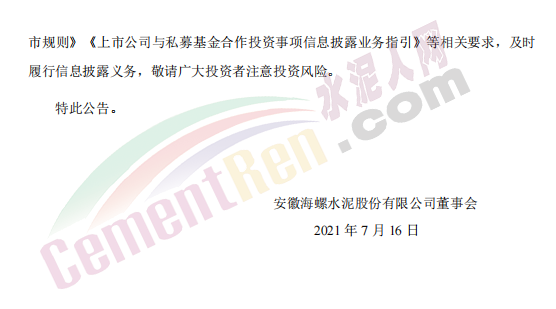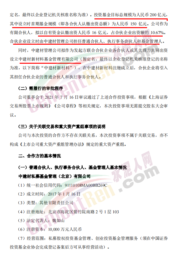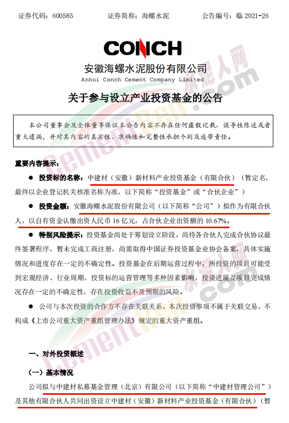當(dāng)日晚間,海螺水泥(600585.SH)發(fā)布公告稱,公司擬與中建材私募基金管理(北京)有限公司(簡(jiǎn)稱“中建材管理公司”)及其他有限合伙人共同出資設(shè)立中建材(安徽)新材料產(chǎn)業(yè)投資基金(有限合伙)(暫定名,最終以企業(yè)登記機(jī)關(guān)核準(zhǔn)名稱為準(zhǔn))。