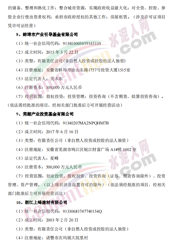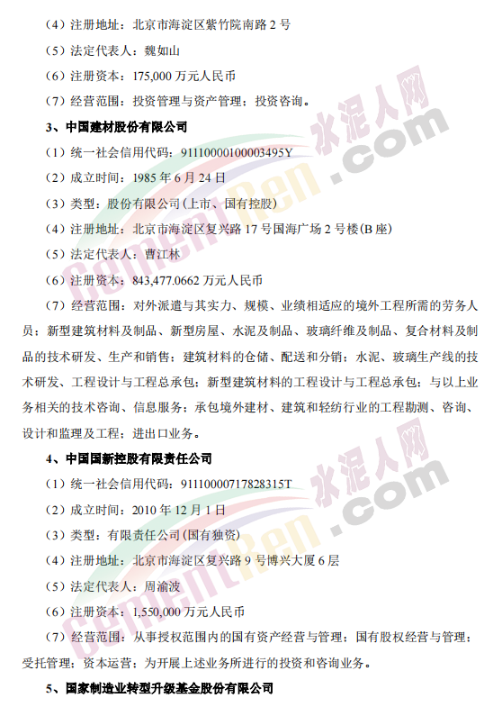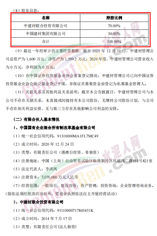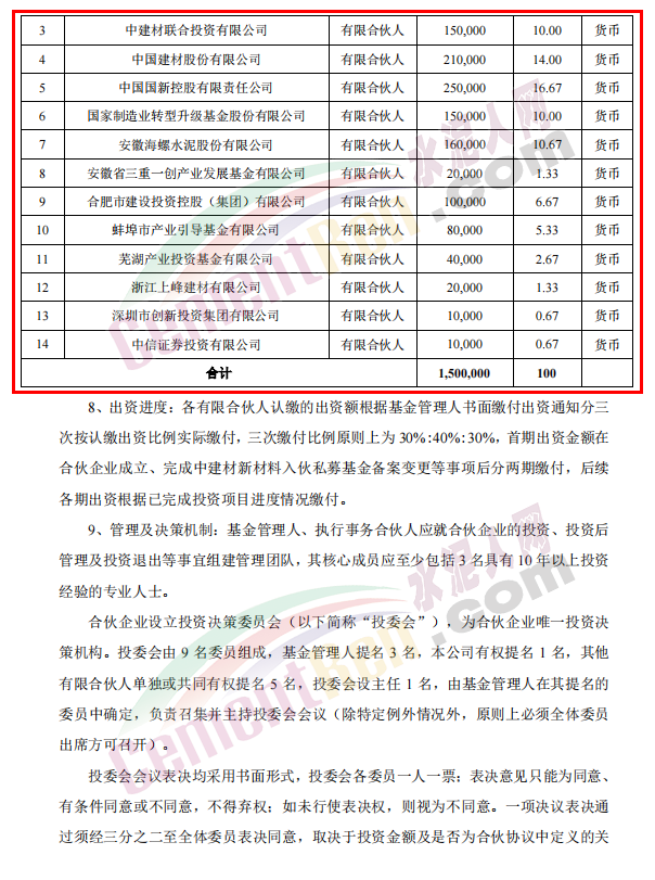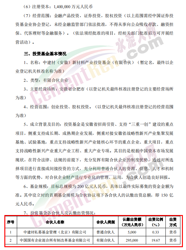 中建材新材料產(chǎn)業(yè)基金分別由中國(guó)國(guó)有企業(yè)混合所有制改革基金、國(guó)家制造業(yè)轉(zhuǎn)型升級(jí)基金股份、國(guó)新控股、中建材私募基金管理(北京)有限公司、中建材聯(lián)合投資有限公司、中國(guó)建材、安徽省三重一創(chuàng)產(chǎn)業(yè)發(fā)展基金、蚌埠市產(chǎn)業(yè)引導(dǎo)基金、蕪湖產(chǎn)業(yè)投資基金、海螺水泥、合肥建投、上峰建材、深創(chuàng)投、中信證券投資等14家單位共同出資設(shè)立,其中普通合伙人中建材私募基金管理(北京)有限公司為基金管理人。