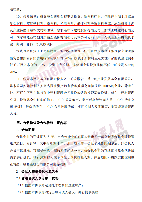 投資領(lǐng)域:投資基金的資金將重點(diǎn)投資于新材料產(chǎn)業(yè),包括但不限于纖維及復(fù)合材料、玻璃基材料、膜材料、光電材料、晶體材料等新材料領(lǐng)域,適當(dāng)投資于涉及產(chǎn)業(yè)轉(zhuǎn)型升級(jí)相關(guān)材料領(lǐng)域。除非經(jīng)中國(guó)建材股份有限公司、浙江上峰建材有限公司、國(guó)家制造業(yè)轉(zhuǎn)型升級(jí)基金股份有限公司及本公司協(xié)商一致,合伙企業(yè)不得投資水泥、商混、骨料、機(jī)制砂項(xiàng)目。