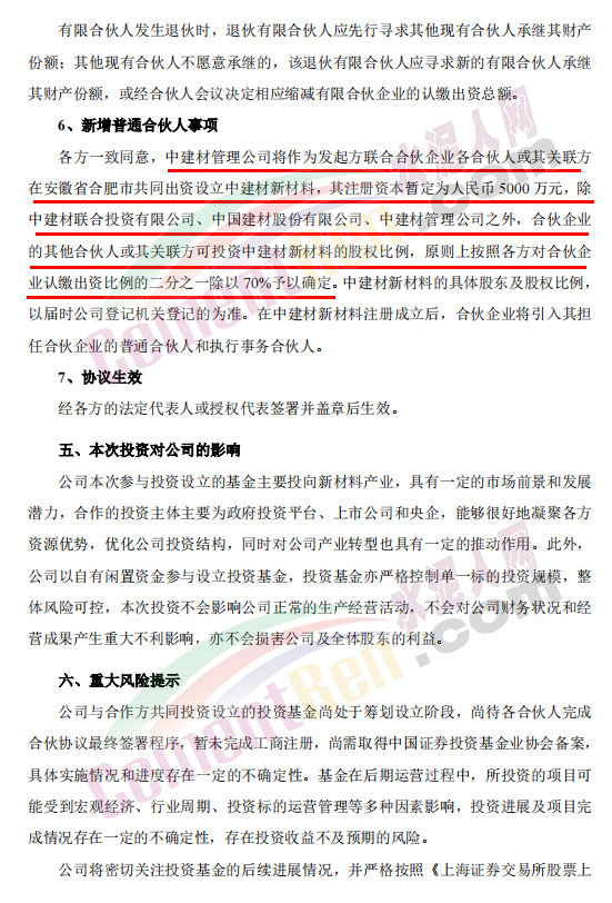 同時(shí),中建材管理公司擬作為發(fā)起方聯(lián)合合伙企業(yè)各合伙人或其關(guān)聯(lián)方共同出資設(shè)立中建材新材料基金管理有限公司(暫定名,最終以企業(yè)登記機(jī)關(guān)核準(zhǔn)登記的名稱為準(zhǔn),簡(jiǎn)稱“中建材新材料”),在中建材新材料注冊(cè)成立后,合伙企業(yè)將引入其擔(dān)任合伙企業(yè)的普通合伙人和執(zhí)行事務(wù)合伙人。