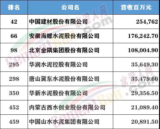 今年上榜公司的年營收門檻接近174億元。受到新冠疫情影響,今年的上榜公司年收入門檻相比去年近178億元的門檻降低了2.3%。去年中國GDP突破100萬億元,今年榜上500家上市公司的收入總和達53萬億元,超過了中國當年GDP的一半。其中中國建材股份有限公司、安徽海螺水泥股份有限公司、北京金隅集團股份有限公司、華潤水泥控股有限公司、唐山冀東水泥股份有限公司、華新水泥股份有限公司、內蒙古西水創(chuàng)業(yè)股份有限公司、中國山水水泥集團有限公司等8家水泥行業(yè)上市企業(yè)上榜。