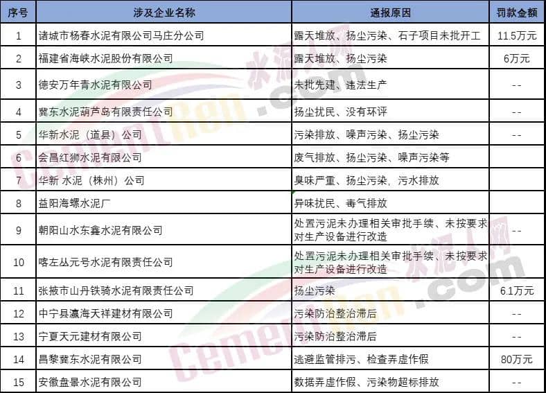 各省市地區(qū)生態(tài)環(huán)境部門通報冀東水泥、盤景水泥、福建水泥等水泥企業(yè)弄虛作假,污染超標(biāo)、未批先建、整治進度滯后等問題