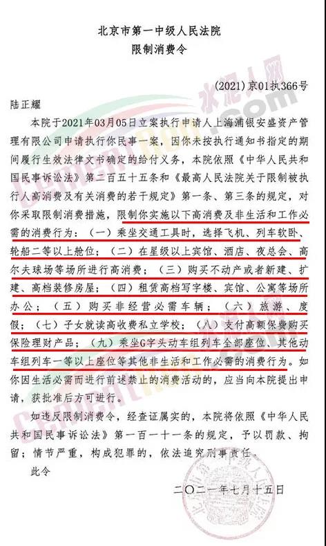 (九)乘坐G字頭動車組列車全部座位、其他動車組列車一等以上座位等其他非生活和工作必需的消費(fèi)行為。如你因生活必需而進(jìn)行前述禁止的消費(fèi)活動的,應(yīng)當(dāng)向本院提出申請,獲批準(zhǔn)后方可進(jìn)行。