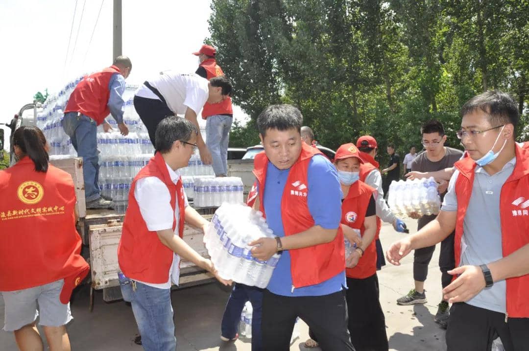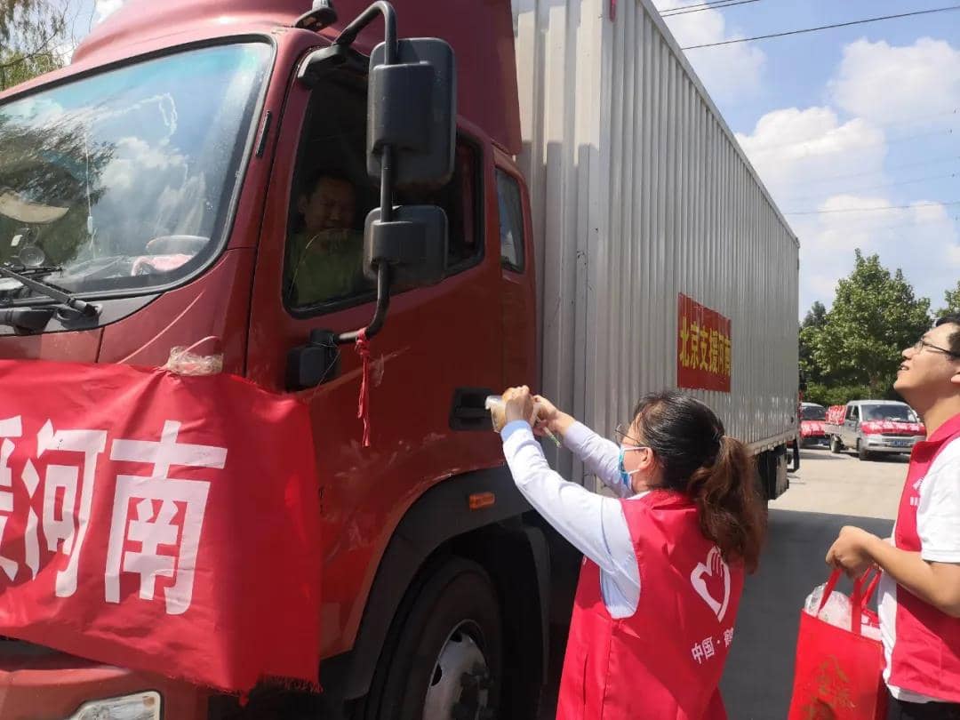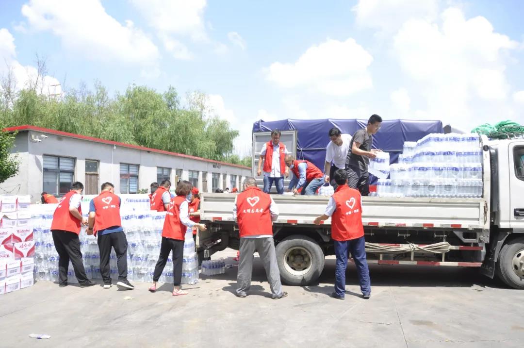 ▲豫鶴同力志愿者幫助馳援車輛卸載礦泉水