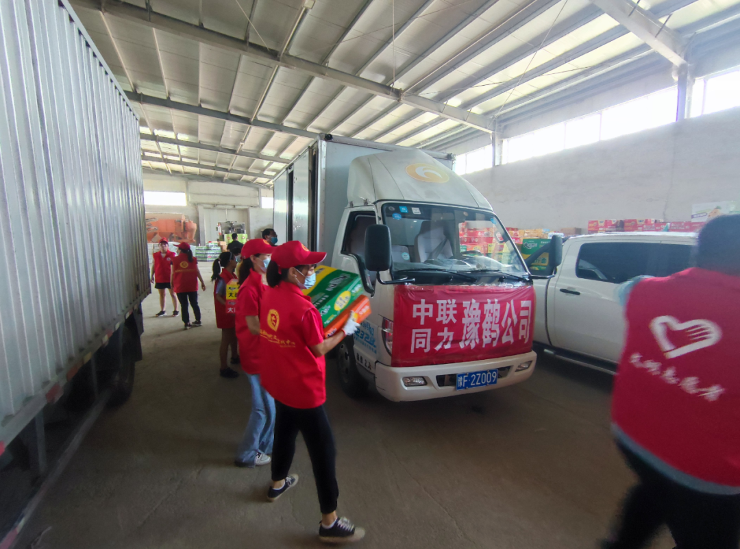 ▲豫鶴同力捐贈(zèng)防汛物資到達(dá)浚縣卸車
