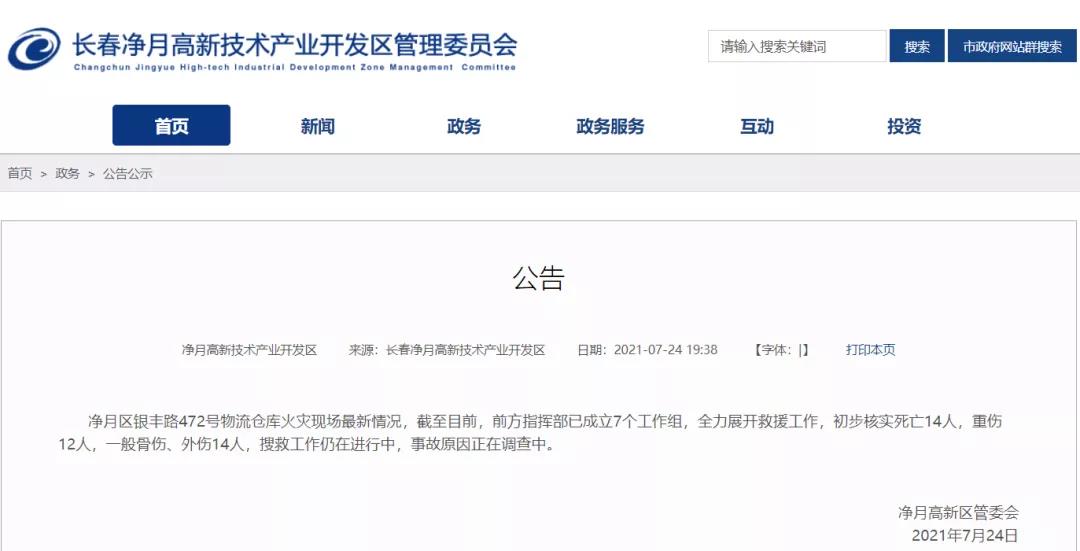 記者從長春凈月高新技術產(chǎn)業(yè)開發(fā)區(qū)了解到,該區(qū)一物流倉庫24日下午發(fā)生火災。截至記者發(fā)稿時,初步核實死亡14人,重傷12人,一般骨傷、外傷14人,搜救工作仍在進行中,事故原因正在調查中。