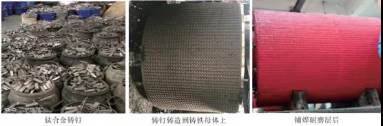 公司于2019年9月將復(fù)合輥改為一種新型鑄釘輥。這種新型鑄釘輥,將鈦合金鑄釘排列到磨具內(nèi),再鑄造到高強(qiáng)度無磁鑄鋼母材上,鑄釘間鋪焊耐磨材料,鑄釘斷面鋪焊平后,再人工鋪焊耐磨“一”字紋。使用過程中,當(dāng)耐磨“一”字紋磨損后,在現(xiàn)場人工補(bǔ)焊即可。經(jīng)考察使用廠家,該新型鑄釘輥具有耐磨性能好、使用周期長、現(xiàn)場補(bǔ)焊方便、維修費(fèi)用低等特點(diǎn)。