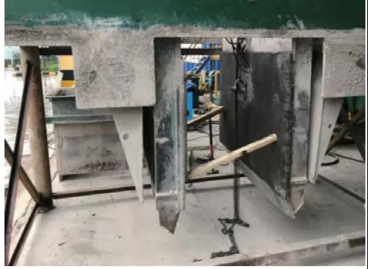 更換過程中,發(fā)現(xiàn)復(fù)合輥輥面兩端大約有50mm長沒有磨損,說明兩端50mm長沒有做功。所以,更換新型鑄釘輥前,把接料裝置耐磨板兩端各增加50mm長度,提高輥壓機(jī)功效。
