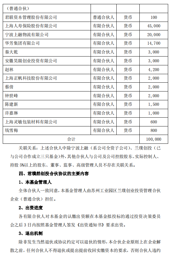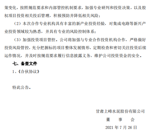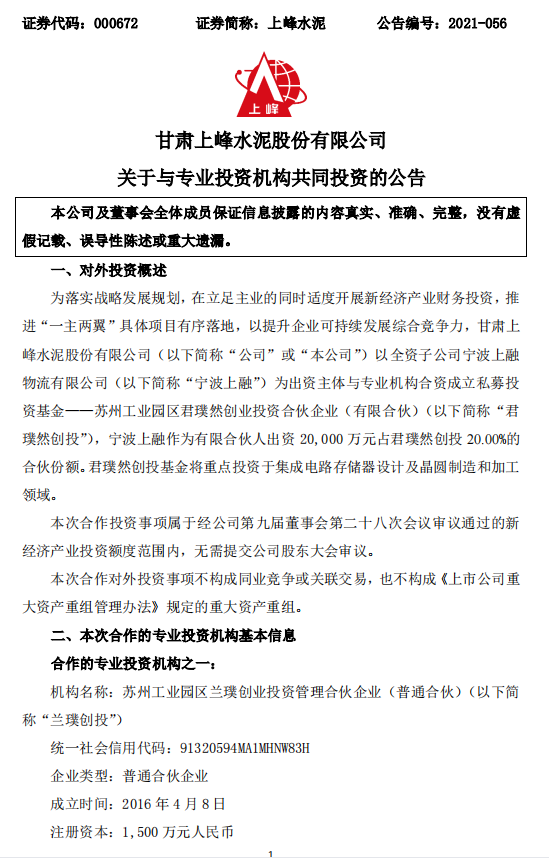 上峰水泥(000672)7月26日晚間公告,公司擬以全資子公司寧波上融物流有限公司(簡稱“寧波上融”)為出資主體與專業(yè)機構(gòu)合資成立私募投資基金――蘇州工業(yè)園區(qū)君璞然創(chuàng)業(yè)投資合伙企業(yè)(有限合伙)(簡稱“君璞然創(chuàng)投”),寧波上融作為有限合伙人出資2億元占君璞然創(chuàng)投20.00%的合伙份額。君璞然創(chuàng)投基金將重點投資于集成電路存儲器設(shè)計及晶圓制造和加工領(lǐng)域。