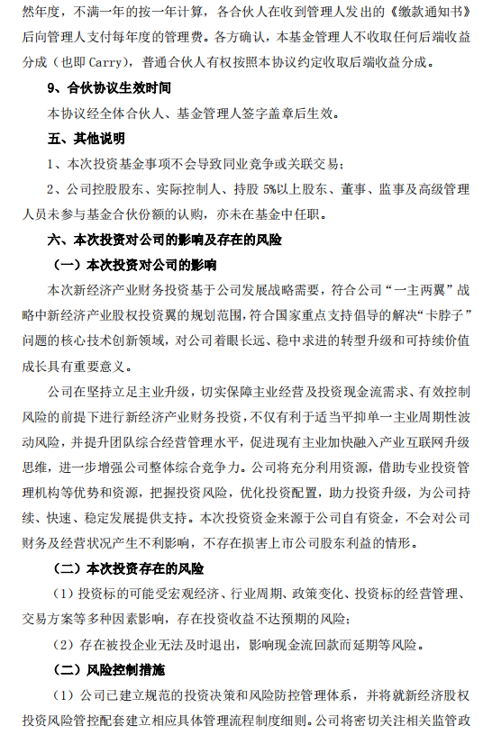 公司稱,本次新經(jīng)濟產(chǎn)業(yè)財務(wù)投資基于公司發(fā)展戰(zhàn)略需要,符合公司“一主兩翼”戰(zhàn)略中新經(jīng)濟產(chǎn)業(yè)股權(quán)投資翼的規(guī)劃范圍,對公司著眼長遠、穩(wěn)中求進的轉(zhuǎn)型升級和可持續(xù)價值成長具有重要意義。