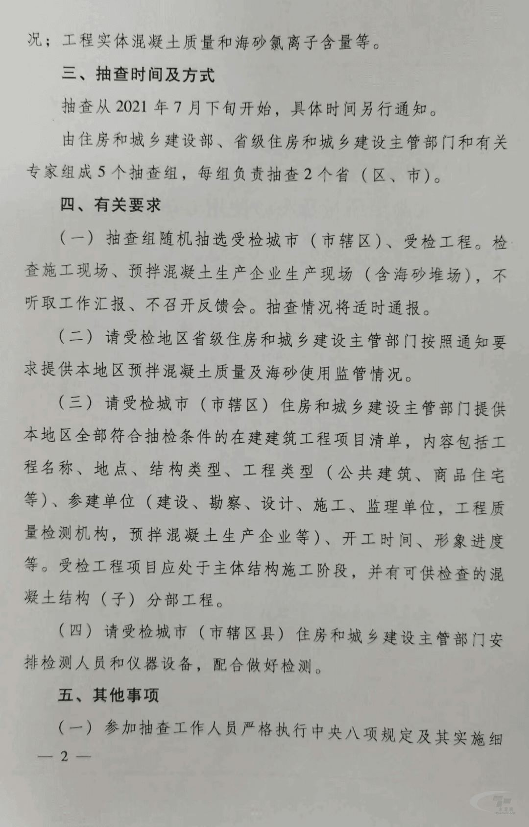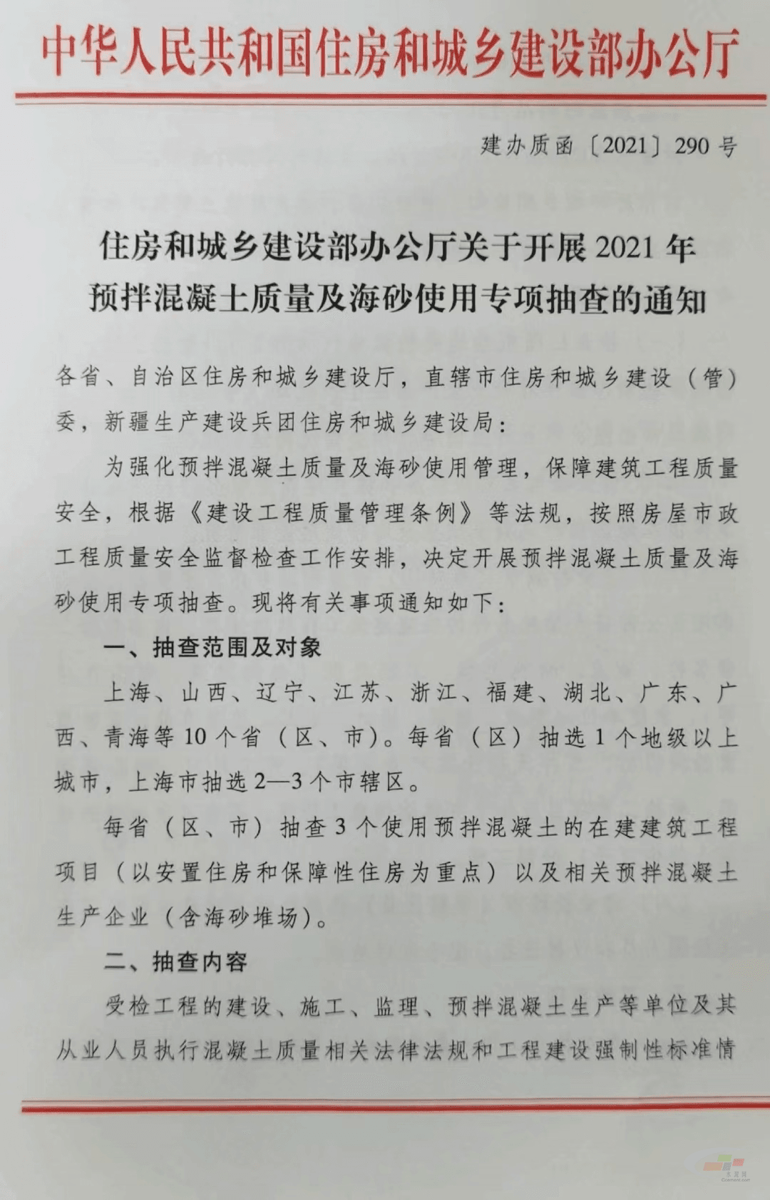 近日,住建部發(fā)布關(guān)于開展2021預(yù)拌混凝土質(zhì)量及海砂使用專項(xiàng)檢查通知。