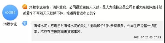 面對(duì)連續(xù)下跌的股價(jià),有投資者對(duì)海螺水泥提出質(zhì)疑稱:公司股價(jià)最近天天跌,是人為操控還是公司有重大經(jīng)營(yíng)問題未披露?不可能天天跌跌不休,難道奔著退市去的?