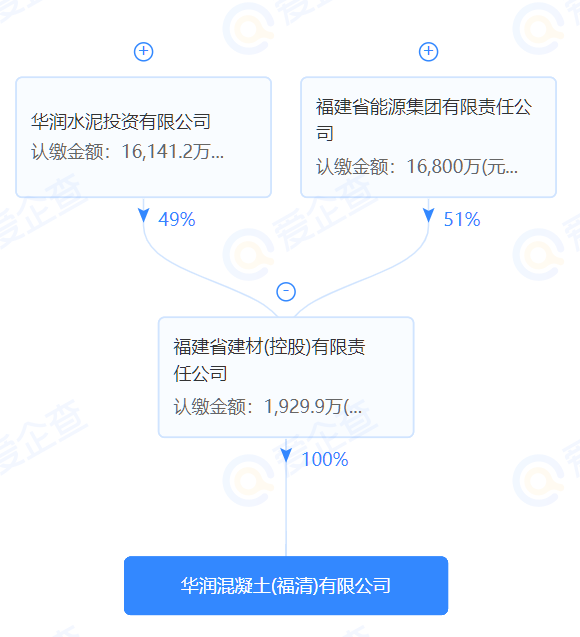 據(jù)查詢,華潤混凝土(福清)有限公司為福建省建材(控股)有限公司100%控股子公司,為福建省能源集團有限責任公司和華潤水泥投資有限公司間接股權公司。