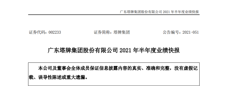 據(jù)塔牌集團7月29日發(fā)布上半年財務快報,2021年上半年,公司實現(xiàn)水泥產(chǎn)量1043.52萬噸、銷量1009.41萬噸,較上年同期分別增長了41.36%、49.39%;實現(xiàn)營業(yè)收入363356.04萬元,較上年同期上升了29.80%;實現(xiàn)利潤總額、歸屬于上市公司股東的凈利潤分別為120,587.05萬元、91,460.72萬元,較上年同期分別小幅下降了1.42%、0.46%。