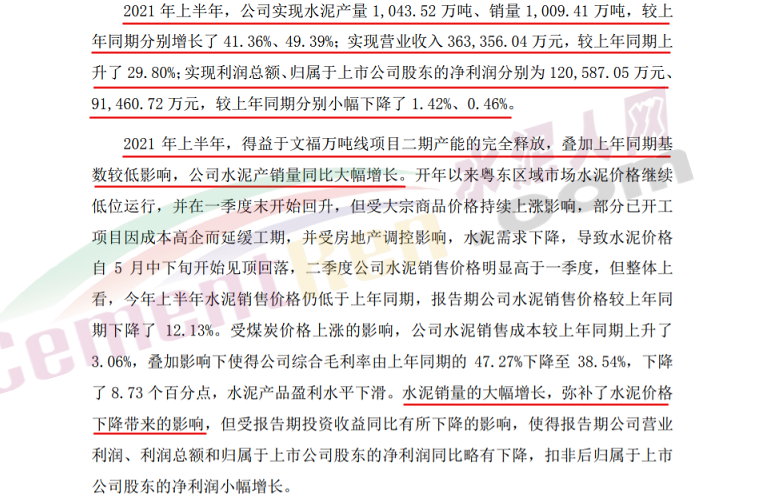 另外公司解釋道,之所以有這個業(yè)績,得益于文福萬噸線項目二期產(chǎn)能的完全釋放,疊加上年同期基數(shù)較低影響,公司水泥產(chǎn)銷量同比大幅增長。水泥銷量的大幅增長,彌補了水泥價格下降帶來的影響,但受報告期投資收益同比有所下降的影響,使得報告期公司營業(yè)利潤、利潤總額和歸屬于上市公司股東的凈利潤同比略有下降,而其他指標產(chǎn)量、營收表現(xiàn)優(yōu)異。