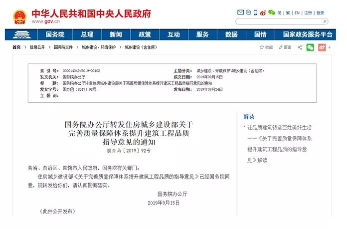 2019年國務院辦公廳發(fā)布了關于完善質量保障體系提升建筑工程品質指導意見,明確要求,推進工程質量管理標準化,將質量管理要求落實到每個項目和員工。建立質量責任標識制度,對關鍵工序、關鍵部位隱蔽工程實施舉牌驗收,加強施工記錄和驗收資料管理,實現(xiàn)質量責任可追溯。