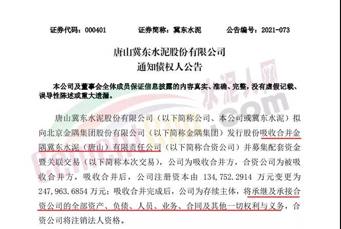 7月30日,冀東水泥上市公司發(fā)布《通知債權(quán)人公告》稱,唐山冀東水泥股份有限公司(以下簡稱公司、本公司或冀東水泥)擬向北京金隅集團(tuán)股份有限公司(以下簡稱金隅集團(tuán))發(fā)行股份吸收合并金隅冀東水泥(唐山)有限責(zé)任公司(以下簡稱合資公司)并募集配套資金暨關(guān)聯(lián)交易(以下簡稱本次交易),公司為吸收合并方,合資公司為被吸收合并方,吸收合并后,公司注冊(cè)資本由134,752.2914萬元變更為247,963.6854萬元;吸收合并完成后,公司為存續(xù)主體,將承繼及承接合資公司的全部資產(chǎn)、負(fù)債、人員、業(yè)務(wù)、合同及其他一切權(quán)利與義務(wù),合資公司將注銷法人資格。