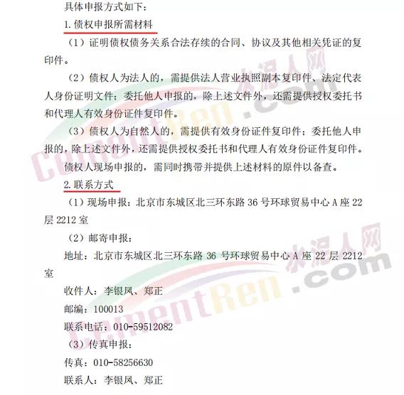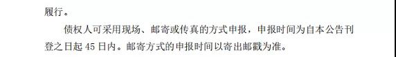 債權(quán)人可采用現(xiàn)場(chǎng)、郵寄或傳真的方式申報(bào),申報(bào)時(shí)間為自本公告刊登之日起45日內(nèi)。郵寄方式的申報(bào)時(shí)間以寄出郵戳為準(zhǔn)。