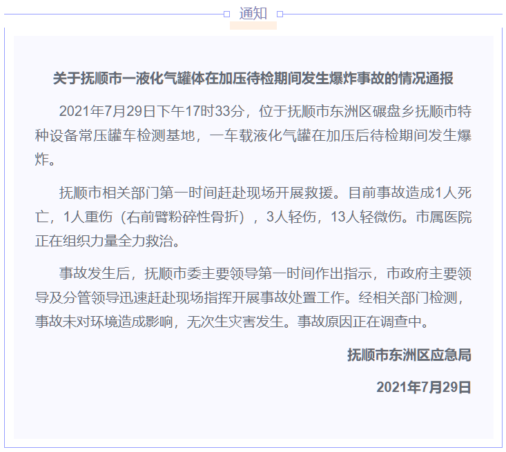 7月29日遼寧省撫順市東洲區(qū)應(yīng)急局發(fā)布《關(guān)于撫順市一液化氣罐體在加壓待檢期間發(fā)生爆炸事故的情況通報》稱,2021年7月29日下午17時33分,位于撫順市東洲區(qū)碾盤鄉(xiāng)撫順市特種設(shè)備常壓罐車檢測基地,一車載液化氣罐在加壓后待檢期間發(fā)生爆炸。