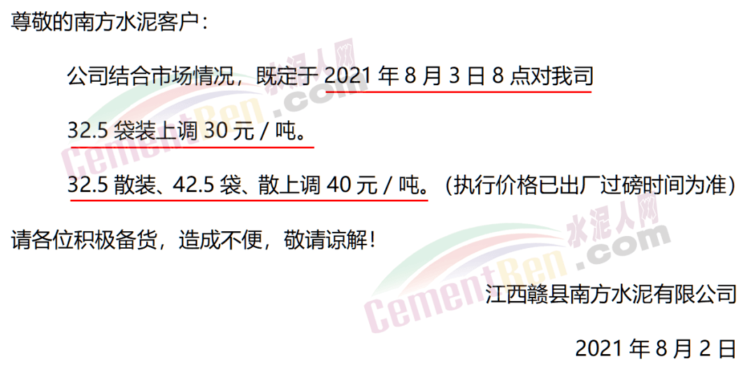 江西贛縣南方水泥有限公司通知,今日(8月3日)上午8時起32.5袋裝上調(diào)30元/噸,32.5袋裝上調(diào)30元/噸。