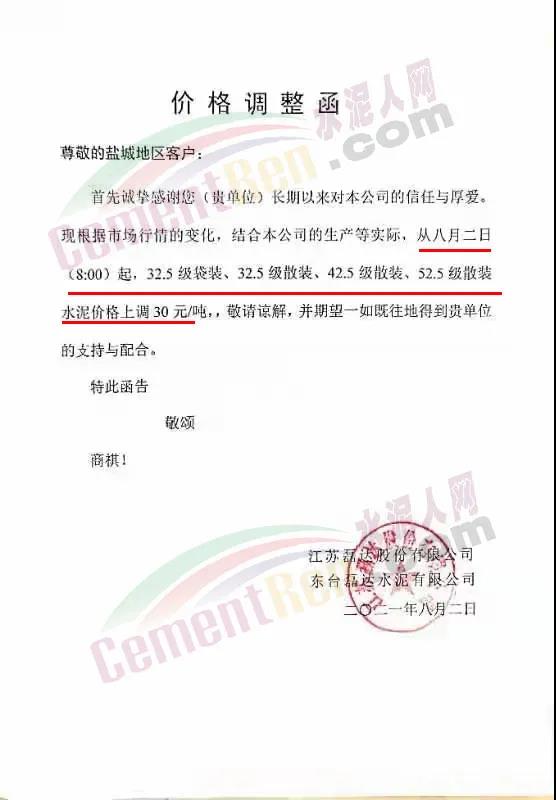 江蘇磊達水泥通知鹽城地區(qū)客戶,從8月2日8時起,32.5級、42.5級水泥價格上調(diào)30元/噸。