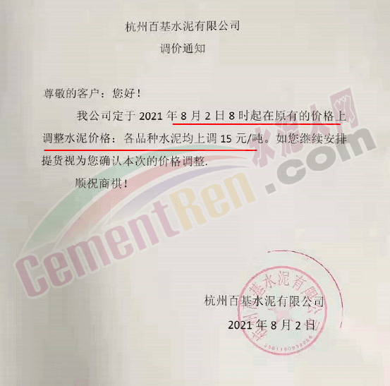 杭州百基水泥通知8月2日8時起在原有價格上各品種水泥上調(diào)15元/噸。