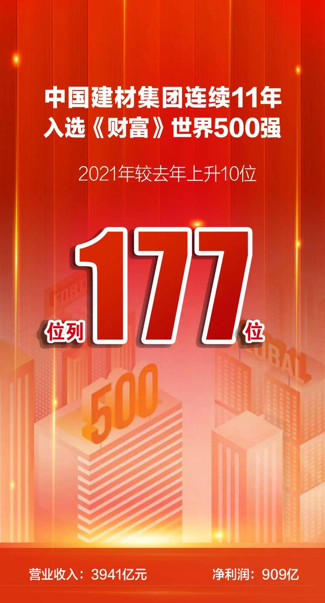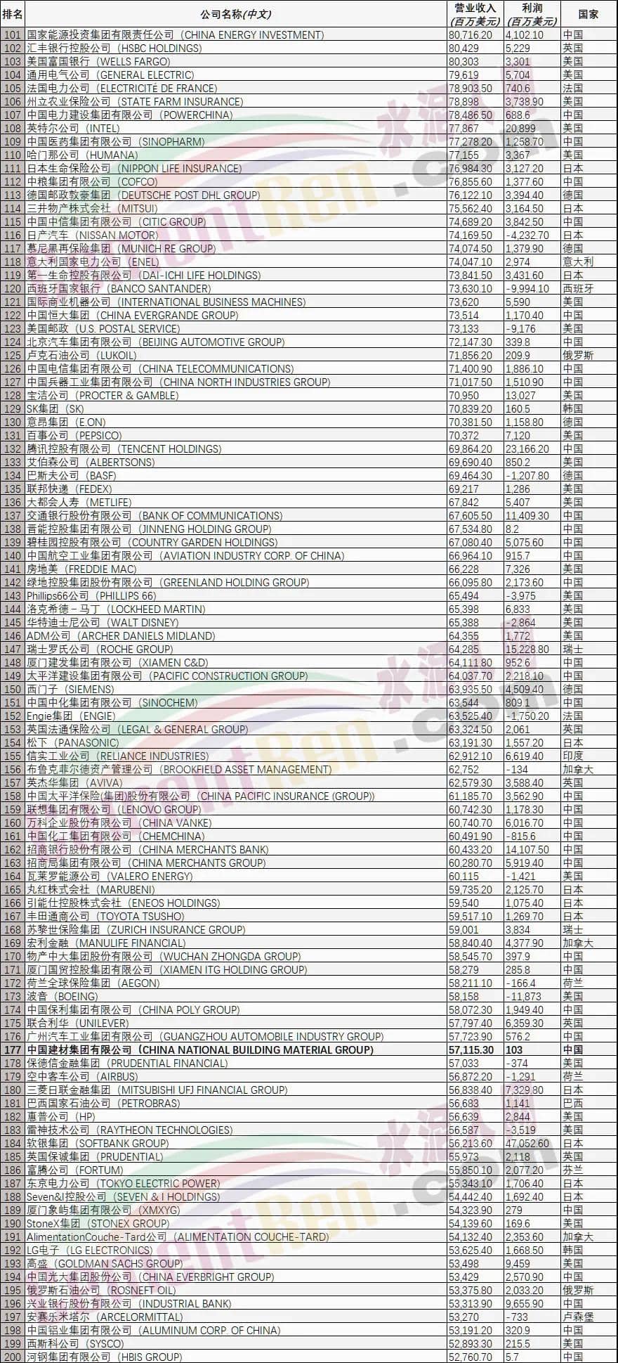8月2日,2021年《財(cái)富》世界500強(qiáng)排行榜發(fā)布,中國(guó)建材集團(tuán)以571.15億美元連續(xù)第11年入圍該榜單,位列177位,比上一年度前進(jìn)10位,繼續(xù)穩(wěn)坐全球建材行業(yè)榜首位置。同時(shí)上榜的建材企業(yè)還有法國(guó)圣戈班集團(tuán)266位,安徽海螺集團(tuán)315位,愛(ài)爾蘭CRH441位。