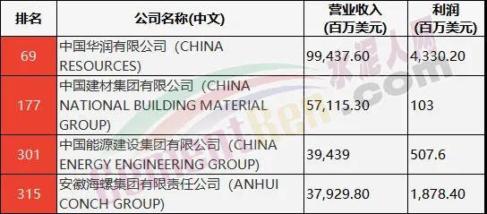 國(guó)內(nèi)企業(yè)經(jīng)營(yíng)項(xiàng)目中包含水泥業(yè)務(wù)的上榜企業(yè)有:中國(guó)華潤(rùn)有限公司;中國(guó)能源建設(shè)集團(tuán)有限公司。上述四家企業(yè)排名、營(yíng)業(yè)收及利潤(rùn)如下表: