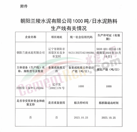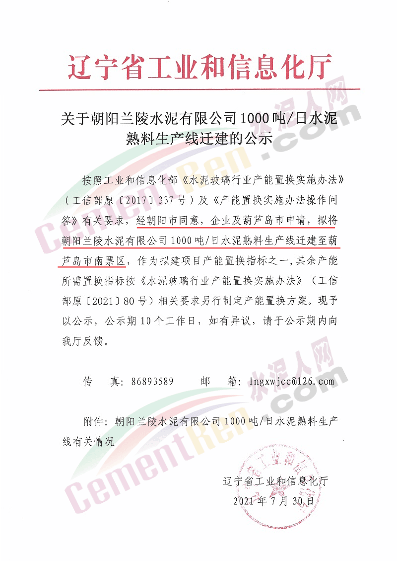 7月30日,遼寧省工信廳發(fā)布關(guān)于朝陽蘭陵水泥有限公司1000噸/日水泥熟料生產(chǎn)線遷建的公示。方案經(jīng)朝陽市同意、企業(yè)和葫蘆島市申請,擬將朝陽蘭陵水泥有限公司1000噸/日水泥熟料生產(chǎn)線遷建至葫蘆島市南票區(qū),原址生產(chǎn)線計劃在2023年10月25日關(guān)停,公示如下: