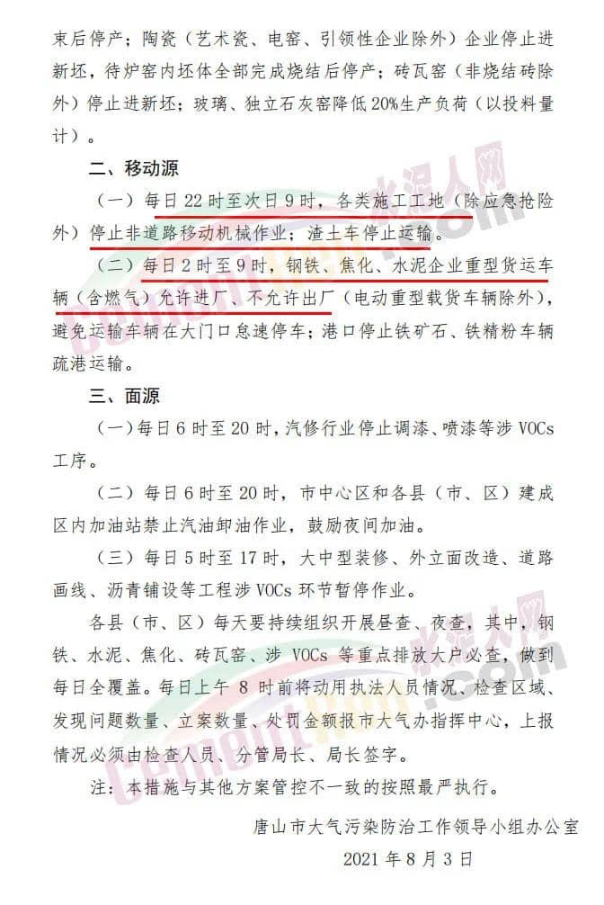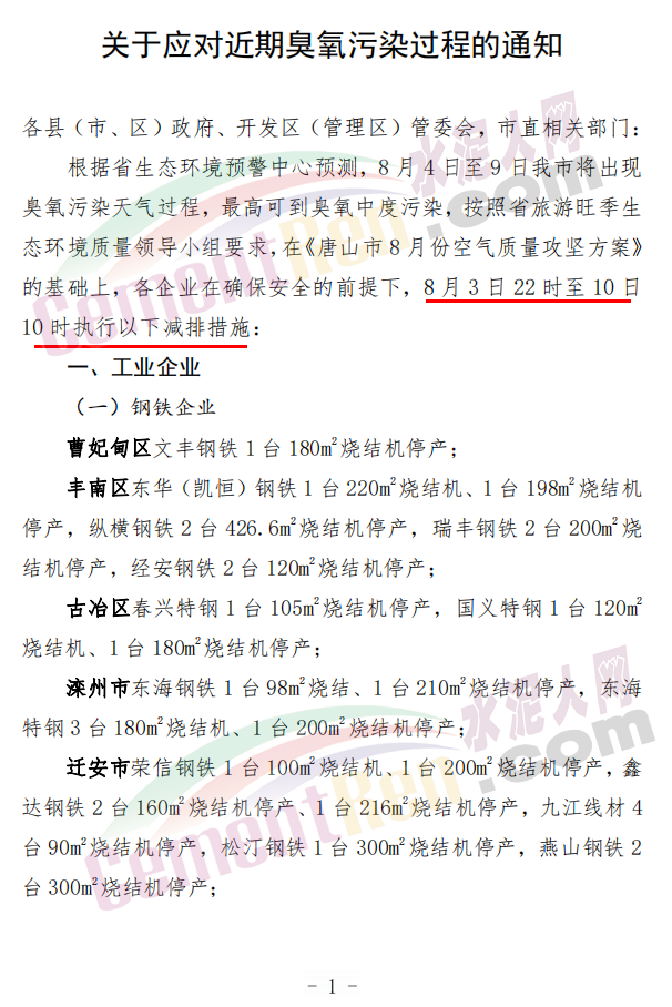 8月3日唐山市發(fā)布《關(guān)于應(yīng)對近期臭氧污染過程的通知》稱,8月3日22時(shí)至10日10時(shí)執(zhí)行減排措施: