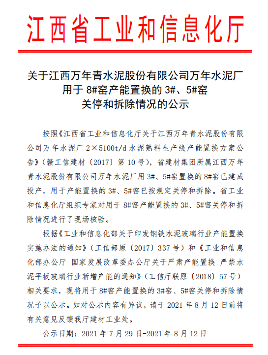 同期,江西省工業(yè)和信息化廳發(fā)布《關(guān)于江西萬年青水泥股份有限公司萬年水泥廠用于8#窯產(chǎn)能置換的3#、5#窯關(guān)停和拆除的公示》稱,按照《江西省工業(yè)和信息化廳關(guān)于江西萬年青水泥股份有限公司萬年水泥廠2×5100t/d水泥熟料生產(chǎn)線產(chǎn)能置換方案公告》(贛工信建材〔2017〕第10號),省建材集團(tuán)所屬江西萬年青水泥股份有限公司萬年水泥廠用3#、5#窯置換的8#窯已建成投產(chǎn),用于產(chǎn)能置換的3#、5#窯已按規(guī)定關(guān)停和拆除。省工業(yè)和信息化廳組織專家對用于8#窯產(chǎn)能置換的3#、5#窯關(guān)停和拆除情況進(jìn)行了現(xiàn)場核驗(yàn)。