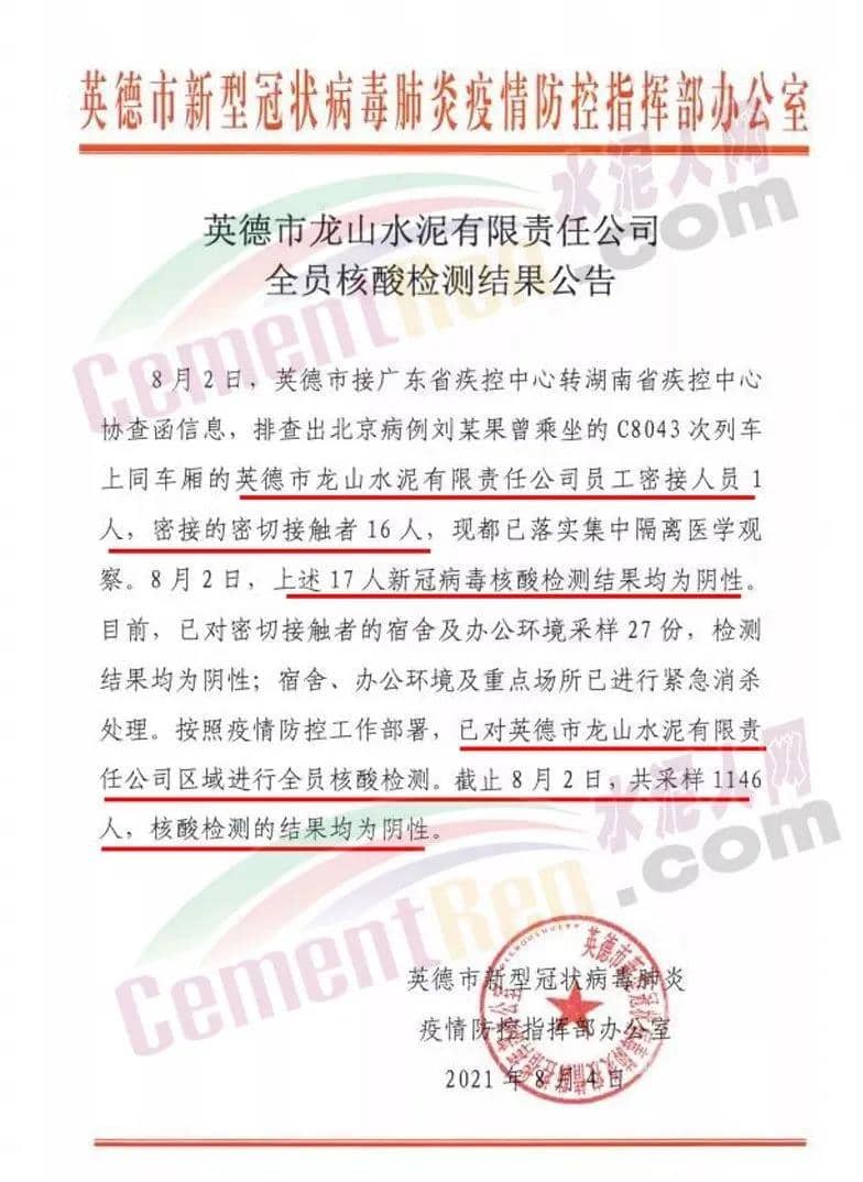 8月2日,上述17人新冠病毒核酸檢測結(jié)果均為陰性。目前,已對密切接觸者的宿舍及辦公環(huán)境采樣27份,檢測結(jié)果均為陰性;宿舍、辦公環(huán)境及重點(diǎn)場所已進(jìn)行緊急消殺處理。按照疫情防控工作部署,已對英德市龍山水泥有限責(zé)任公司區(qū)域進(jìn)行全員核酸檢測。截止8月2日,共采樣1146人,核酸檢測的結(jié)果均為陰性。