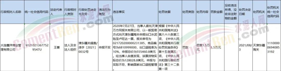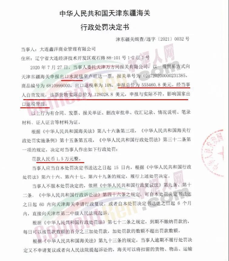 日前天津海關(guān)發(fā)布行政處罰決定書,其中提到出口水泥毯申請與實際不符,影響國家出品退稅管理被處罰人民幣1.5萬元。