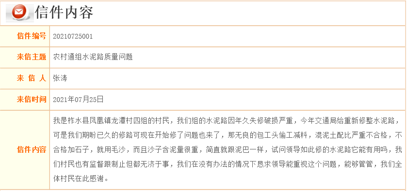 日前,有村民有陜西省商洛政府網(wǎng)市長(zhǎng)信箱留言反應(yīng)農(nóng)村通組水泥路質(zhì)量問(wèn)題稱:“我是柞水縣鳳凰鎮(zhèn)龍?zhí)洞逅慕M的村民,我們組的水泥路因年久失修破損嚴(yán)重,今年交通局給重新修整水泥路,可是我們期盼已久的修路可現(xiàn)在開(kāi)始修了問(wèn)題也來(lái)了,那無(wú)良的包工頭偷工減料,混凝土配比嚴(yán)重不合格,不合格加石子,就用毛沙,而且沙子含泥量很重,簡(jiǎn)直就跟泥巴一樣,試問(wèn)領(lǐng)導(dǎo)如此修的水泥路它能有用嗎,我們村民也有監(jiān)督跟制止但都無(wú)濟(jì)于事,我們?cè)跊](méi)有辦法的情況下懇求領(lǐng)導(dǎo)能重視這個(gè)問(wèn)題,能夠管管,我們?nèi)w村民在此感謝。”