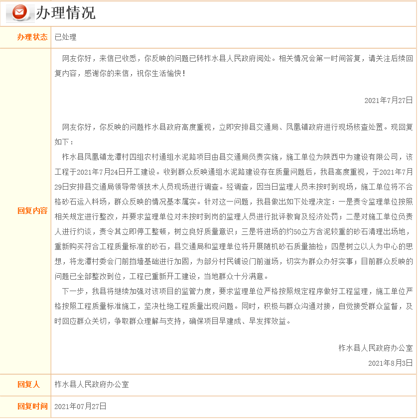 8月3日,柞水縣人民政府辦公室作出回復(fù),柞水縣政府高度重視,立即安排縣交通局、鳳凰鎮(zhèn)政府進(jìn)行現(xiàn)場(chǎng)核查處置。并回復(fù)如下:
