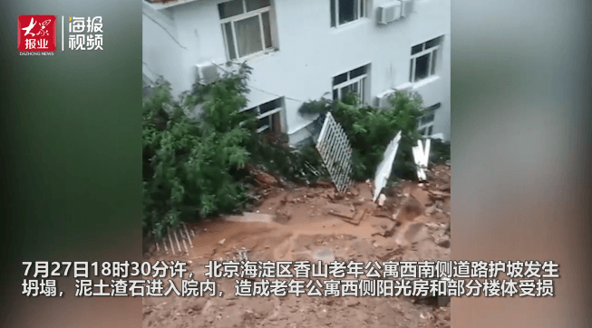 7月27日18時(shí)30分許,北京海淀區(qū)香山老年公寓西南側(cè)道路護(hù)坡坍塌,泥土渣石進(jìn)入院內(nèi),造成西側(cè)陽(yáng)光房和部分樓體受損,造成老年公寓5人遇難。據(jù)了解,當(dāng)日香山地區(qū)雨量3小時(shí)累計(jì)達(dá)100mm。由于雨水太大,街上的雨水甚至超過(guò)了街道兩側(cè)臺(tái)階的高度。