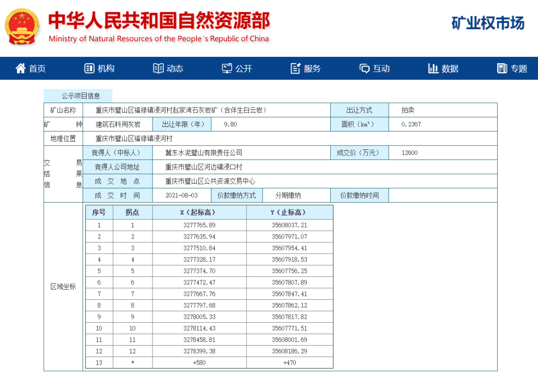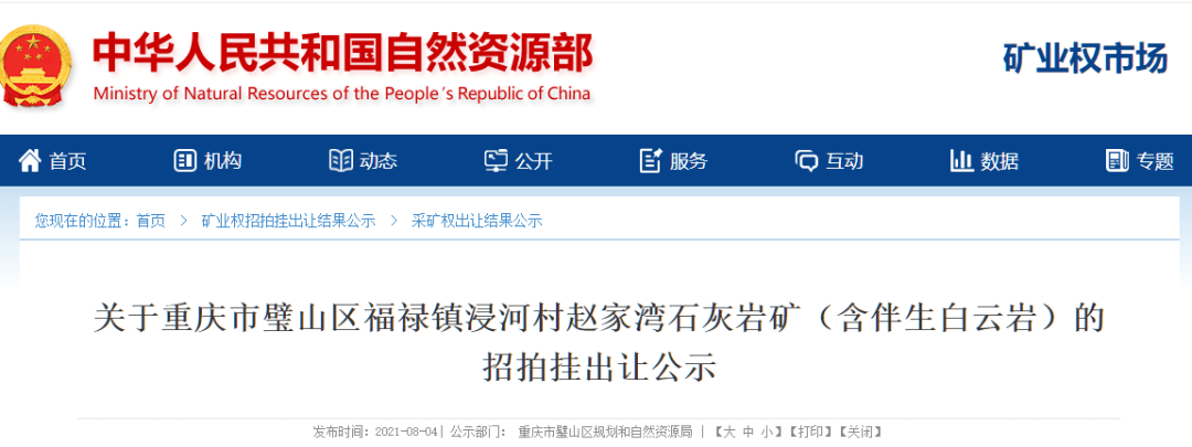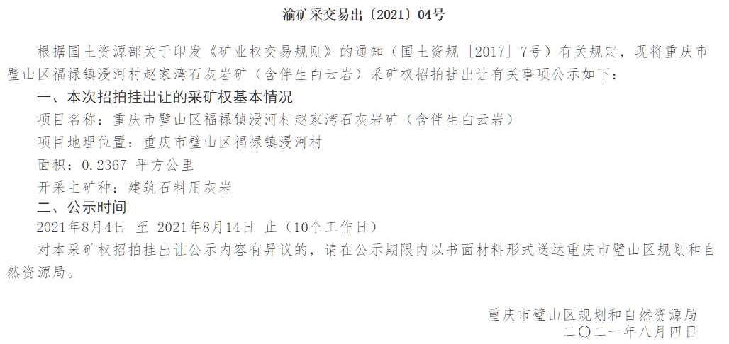 8月4日,中華人民共和國(guó)自然資源部發(fā)布《關(guān)于重慶市璧山區(qū)福祿鎮(zhèn)浸河村趙家灣石灰?guī)r礦(含伴生白云巖)的招拍掛出讓公示》。公示文件顯示,中標(biāo)人采礦權(quán)中標(biāo)人為冀東水泥璧山有限責(zé)任公司,成交價(jià)為12600萬(wàn)元,成交時(shí)間為2021年8月3日。