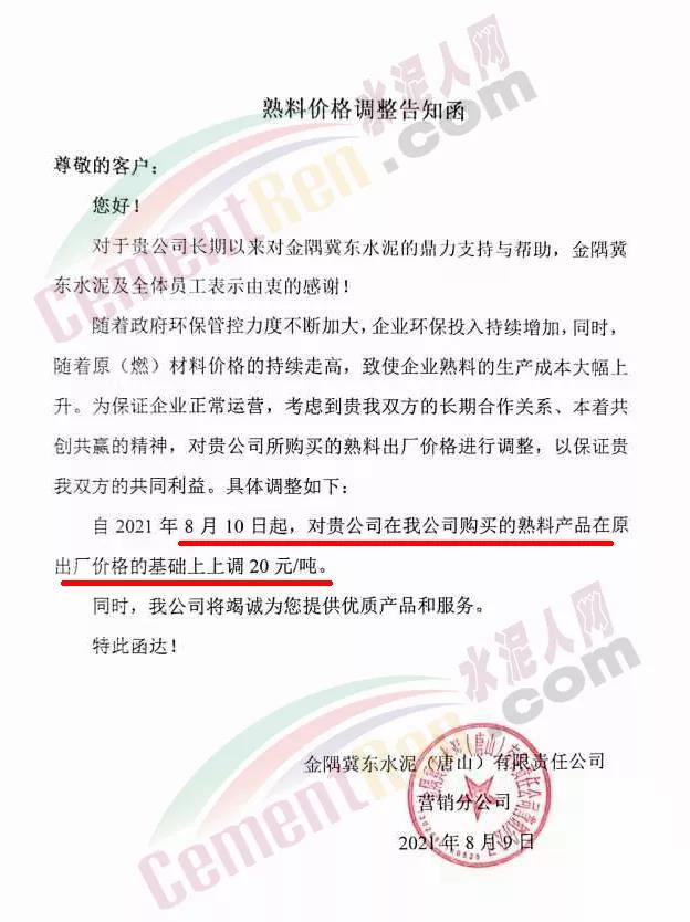 金隅冀東水泥唐山有限責任公司營銷分公司通知,隨著政府環(huán)保管控力度不斷加大,企業(yè)環(huán)保投入持續(xù)增加,同時,隨著原(燃)材料價格的持續(xù)走高,致使企業(yè)熟料的生產(chǎn)成本大幅上升。為保證企業(yè)正常運營,自8月10日起,對熟料產(chǎn)品在原出廠價格的基礎上上調(diào)20元/噸。