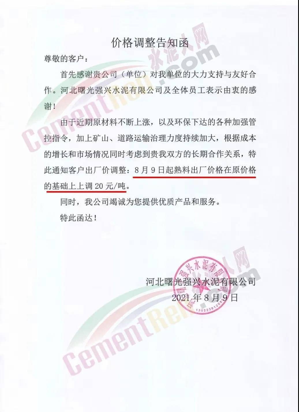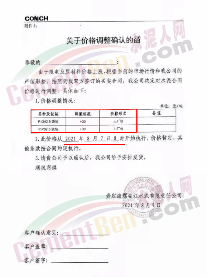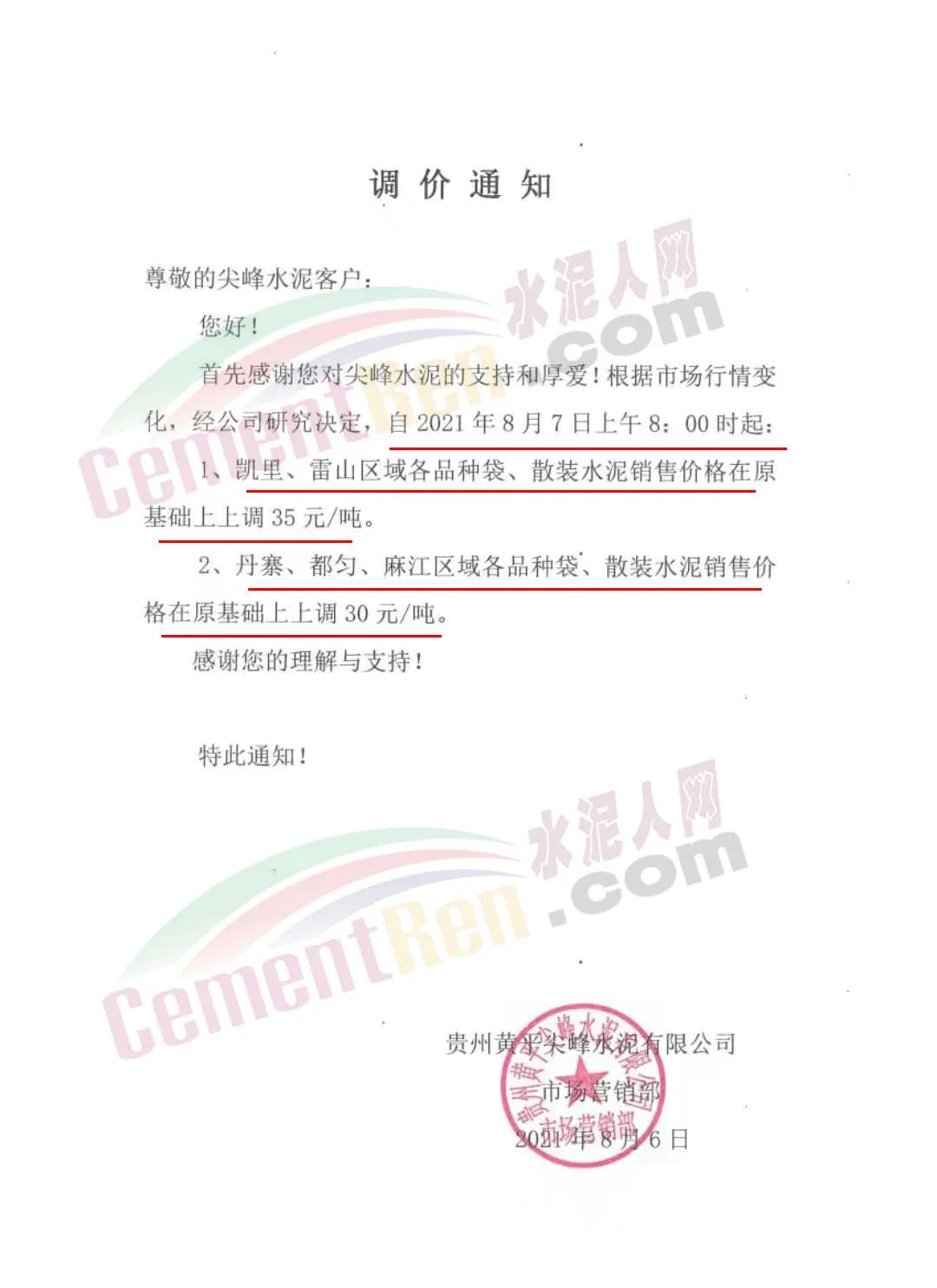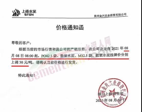 同日,企業(yè)又通知根據(jù)市場行情變化,經(jīng)公司研究決定,自2021年8月7日上午8時起,凱里、雷山區(qū)域各品種袋、散裝水泥銷售價格在原基礎上上調(diào)35元/噸;丹寨、都勻、麻江區(qū)域各品種袋、散裝水泥銷售價格在原基礎上上調(diào)30元/噸。